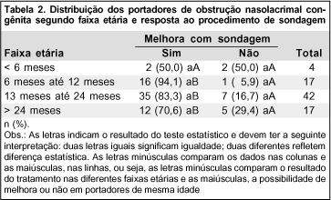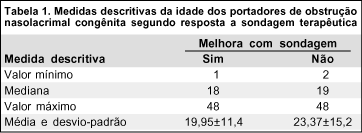 Avaliando a resposta ao tratamento da obstrução congênita da via lacrimal excretora foi observado que a chance de cura com a sondagem é semelhante em crianças no primeiro ou no segundo ano de vida(9).