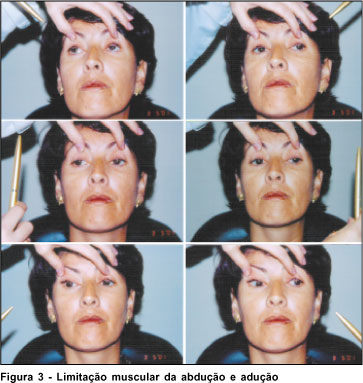 O primeiro caso, R.G. M., 40 anos, feminino, compareceu ao serviço do HOP apresentando quadro clínico de evolução desde os 30 anos com ptose palpebral superior progressiva em ambos os olhos há 10 meses. As queixas principais eram ptose e dificuldade para a leitura (Fig.1). À inspeção, havia ptose assimétrica, com rima palpebral do olho direito (OD) de 9,0 mm e do olho esquerdo(OE) de 6,0 mm (Fig.2). A função do elevador do OD era 11 mm e do OE, 7 mm. Ao exame de motilidade ocular extrínseca revelava importante limitação muscular no teste de versões e ducções, ausência de convergência e ausência do reflexo de Bell. Acuidade visual com correção 6/6 (AO), fundoscopia normal e tonometria 12 mmHg (AO). Ao exame clínico sistêmico apresentou pressão arterial baixa. Exames normais de ECG, planigrafia de mediastino, tomografia de tórax, CPK, LDH e VHS. Exame endocrinológico e exames laboratoriais de TSH, T3 e T4 normais. Ao exame neurológico e laboratorial através de eletromiografia apresentou padrão miopático não específico e, na biópsia muscular revelou-se miopatia mitocondrial, sugestivo de deficiência de citocromo c-oxidase.
