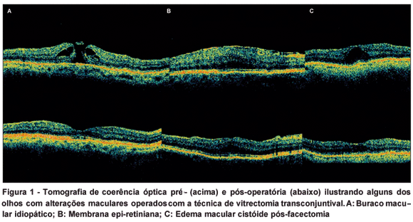 Dos olhos incluídos nesta série, os que tinham doenças maculares (buraco macular, membrana epirretiniana, edema macular cistóide pós-facectomia e edema macular diabético) e os fácicos com DRR foram os que obtiveram os melhores resultados anatômicos preliminares (Figura 1).