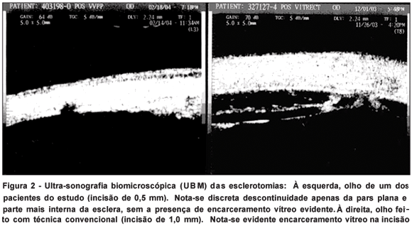 Gonzales et al., utilizando biomicroscopia ultra-sônica (UBM) para comparar as esclerotomias convencionais (1,0 mm) com as desse novo sistema (0,5 mm), não encontraram diferença significativa no tipo e tempo de cicatrização e nem na quantidade de encarceramento vítreo(11). Porém, a figura 2 ilustra a diferença de encarceramento vítreo comparando os dois tipos de incisão em olhos com hemorragia vítrea e retinopatia diabética proliferativa. Estudos futuros poderão esclarecer se esta diferença tem influência no índice de crescimento fibrovascular através das esclerotomias.