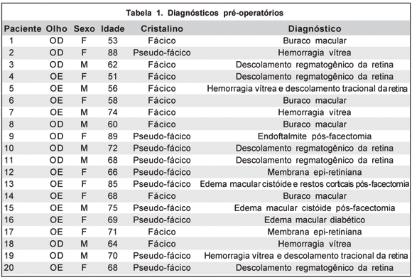 A tabela 1 lista as indicações cirúrgicas dos olhos incluídos no estudo. Pacientes com diagnóstico pré-operatório de descolamento regmatogênico da retina (DRR) com vitreorretinopatia proliferativa avançada, em que tamponamento com óleo de silicone era programado, olhos com descolamentos tracionais da retina extensos e olhos com glaucoma não foram incluídos. Os pacientes pseudofácicos com DRR apresentavam história prévia de rotura de cápsula posterior durante a facectomia.