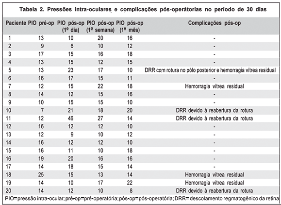 As visitas pós-operatórias foram feitas no primeiro dia, primeira semana e primeiro mês, e os principais dados registrados foram PIO, presença ou ausência de roturas associadas às esclerotomias, presença de descolamento de coróide ou qualquer outra alteração importante de segmento anterior ou posterior.