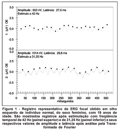 Valores encontrados para o ERG focal variam de acordo com a maneira de captação dos parâmetros avaliados, sendo examinador e sujeito dependente, pois, o primeiro, deve posicionar corretamente o estímulo na região macular, e o segundo, fixar corretamente o centro da mira luminosa, para que as respostas captadas sejam estritamente advindas da retina central e não de áreas retinianas adjacentes à mácula(8); configuração de estímulo -42 Hz ou 31,25 Hz; idade do sujeito, já que há decréscimo na amplitude do ERG focal com o avanço da idade, mesmo em indivíduos normais; tipo de eletrodo corneano; e população estudada(2,9).
