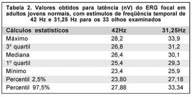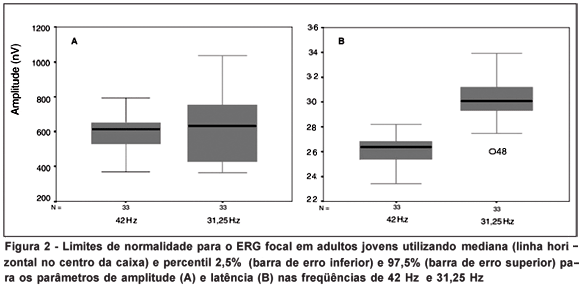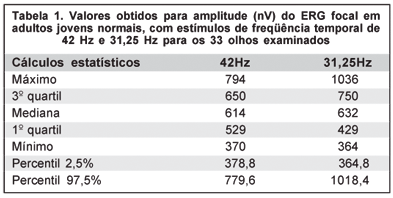 A figura 1 mostra um exemplo representativo de registro do ERG focal de um indivíduo da amostra do sexo feminino, com idade de 19 anos, após estimulação luminosa em freqüências de 42 Hz e 31,25 Hz. Os valores obtidos para a amplitude e latência, nas freqüências temporais de 42 Hz e 31,25 Hz, na amostra de 33 sujeitos, estão contidos na tabela 1 e tabela 2, respectivamente. A figura 2 mostra os limites de normalidade utilizando mediana e percentis 2,5% e 97,5% para amplitude (nV) e latência (ms) do ERG focal obtido a 42Hz e 31,25 Hz.