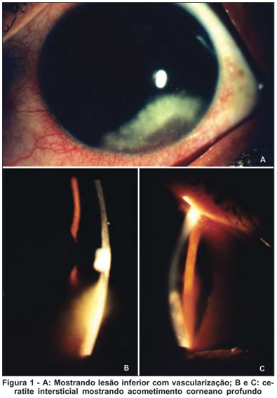 Na biomicroscopia observava-se infiltrados corneanos intersticiais bilateralmente em média-periferia poupando o eixo visual, associados a hiperemia conjuntival reacional e vascularização corneana profunda relacionada às lesões (Figura 1). Nota-se ainda reação de câmara anterior 1+/4+ em ambos os olhos. O exame de fundo de olho foi considerado normal, não evidenciando sinais de vasculite ou edema do nervo óptico em ambos os olhos.