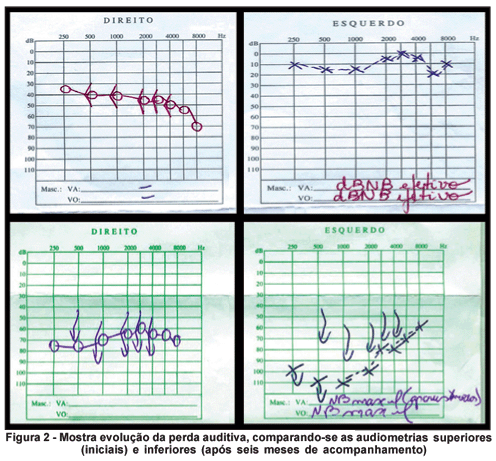 Nos exames laboratoriais a paciente apresentou sorologias negativas para clamídia e sífilis (VDRL e FTABS), hemograma normal, radiografia de tórax normal, audiometria evidenciou perda auditiva neurosensorial bilateralmente (Figura 2), potenciais evocados auditivos de tronco encefálico (BERA) dentro da normalidade, anticorpos anti-cardiolipina negativos (IgG e IgM) negativos, anticorpos anti-citoplasma (ANCA) negativos (P e C ANCA), anticorpos anti-ENA (RNP) não reagente, complemento C4 abaixo dos valores de referência, fator anti-núcleo negativo, complemento C3 acima do normal (214,3 mg/dl; referência de 90 a 180 mg/dl), complemento total normal, anti-HIV 1 e 2 negativos, teste tuberculínico (PPD) de 10 mm, VHS de 40 mm (normal até 20 mm), tomografia de ossos temporais normal, sorologia para Herpes I e II (IgG positivo e IgM negativo).