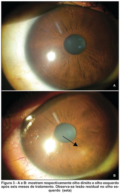 Houve boa evolução do quadro com desaparecimento das lesões no olho direito e diminuição importante destas no olho esquerdo (Figura 3) nestes últimos 6 meses. A paciente evoluiu com hipertensão ocular após introdução do colírio de corticóide e, portanto, este foi suspenso e introduzida medicação tópica antihipertensiva com resolução do quadro.