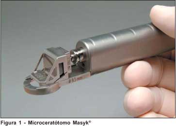 Para evitar a maioria das complicações, é necessária alta reprodutibilidade da espessura e diâmetro da lamela corneana pediculada realizada pelo MK. Muitos estudos têm investigado as vantagens dos diferentes sistemas de MKs(12-17). O Masyk® tem algumas vantagens interessantes. Um maior número de plataformas de corte (130, 140, 160, 180, 200, 250, 300, 350, 400, 450 e 500 µm) possibilitando o uso deste aparelho em ceratomileusis mais profundas, onde se deseja remoção de opacidades estromais profundas, por exemplo. Associado ao fato de que o mesmo aparelho pode ser utilizado em uma câmara artificial desenvolvida e disponibilizado pelo mesmo fabricante, para confecção automática de lamelas corneanas doadoras de diversas espessuras. Outra vantagem é a possibilidade de regular o tamanho do pedículo da lamela corneana. Esta regulagem pode ser alterada por meio de um parafuso abaixo do eixo excêntrico, com ajustes de 0,16 mm ao tamanho do pedículo, até a programação de confecção de lamelas livres. Neste estudo, não houve nenhuma complicação do tipo de lamela corneana livre. A possibilidade de o cirurgião ver a lamela corneana que está sendo confeccionada sair por uma abertura logo atrás da plataforma de aplanação proporciona outra vantagem a este sistema se por ventura a máquina travar ou produzir uma lamela livre. Neste primeiro caso poderar-se-á deixar de pressionar o pedal de avanço da cabeça do aparelho, soltar o vácuo do anel de sucção e, observando a lamela, retirar cuidadosamente o aparelho do olho operado sem arrancar ou danificar a lamela. Outra vantagem é que o Masyk® não precisa de nenhum tipo de montagem sobre o olho, visto que o anel de sucção já está montado no aparelho. O cirurgião deve estar atento para que não haja movimento da mão no momento em que a cabeça do aparelho estiver passando sobre a córnea(11).