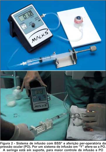 Os olhos porcinos foram retirados imediatamente após os animais serem mortos em abatedouro. As ceratectomias foram realizadas em até 10 horas após a retirada dos olhos. O epitélio foi cuidadosamente checado, antes e após as cirurgias. Olhos com defeitos epiteliais foram excluídos do estudo para evitar viés na aferição da espessura das lamelas corneanas pediculadas. Os olhos foram colocados em um módulo cirúrgico para fixação. Este módulo é composto de um suporte plástico para o olho, preso a um outro suporte de madeira de 10 cm2. No fundo do suporte para os olhos, há, presa, uma agulha que se comunica com o humor vítreo, atravessando o nervo óptico. Esta agulha se comunica, externamente, a um sistema de infusão, para controle da pressão ocular (PO) (Figura 2). A PO foi mantida em 20 mmHg. Para aferição da espessura da lamela corneana pediculada, foram realizadas três medidas com o paquímetro P55 (Paradigm, EUA), subtraindo-se a espessura corneana central pré-operatória da espessura corneana central sem a lamela corneana pediculada, aferida logo após o término de cada procedimento. Para a medida do diâmetro vertical do leito estromal utilizou-se paquímetro digital Mitutoyo (São Paulo, Brasil), que tem alcance de 0 a 15 cm e resolução de 10 µm. Utilizou-se uma lâmina nova para cada procedimento (Bausch & Lomb, EUA). Todas as aferições foram feitas por um único examinador.