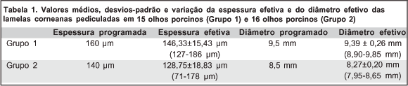 As variações da espessura da lamela corneana pediculada são importantes para correção de moderadas e altas ametropias, assim como em reoperações. Como a lamela não contribui para a estabilidade biomecânica da córnea e um leito estromal residual menor que 250 µm pode resultar em ectasia corneana progressiva(18-20), esta variabilidade da espessura da lamela pode interferir na segurança do LASIK. Em olhos porcinos, a variabilidade da espessura e diâmetro da lamela corneana pediculada com o Masyk® foi semelhante à encontrada na literatura(12,14,21-22) (Ver Quadro). Pode haver diferenças nas aferições entre estudos realizados in vivo ou in vitro, pela diferente elasticidade, tipos de colágeno e hidratação tecidual entre animais. Córneas de porco mostraram maior compressibilidade e elasticidade devido a ausência da camada de Bowman(23). Neste estudo, foi checada a PO com tonômetro de Barraquer antes da passagem do MK. Na literatura pesquisada não encontramos estudos correlacionando PO com tonômetro de Barraquer em olhos humanos e olhos porcinos.