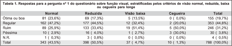 Em relação à pergunta nº 1 do questionário sobre função visual, apesar de 43,5% dos atendidos apresentarem visão normal para longe, apenas 23,6% destes responderam que sua visão estava ótima/boa. Da mesma maneira, das pessoas que foram classificadas como cegas para longe, apenas 30% classificaram sua visão como péssima (Tabela 1).