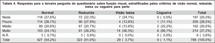 Para a pergunta nº 3 do questionário sobre função visual, que avalia como a visão dificulta as atividades diárias da pessoa, houve todo tipo de resposta, praticamente na mesma quantidade, dentro do grupo de pessoas com visão normal ou reduzida tanto para longe como para perto. As porcentagens variaram de 18,7% a 29,4% para cada resposta (nada, pouco, médio ou muito). Já entre as pessoas que foram classificadas com visão baixa, a maioria respondeu que a visão atrapalha muito suas atividades diárias, tanto para longe (37,8%) como para perto (48,3%). Observa-se que a maioria (90%) das pessoas classificadas como cegas para longe disseram que a visão atrapalha muito suas atividades diárias, mas apenas 2/3 das pessoas classificadas como cegas para perto disseram que a visão atrapalha muito suas atividades diárias (Tabelas 3 e 4).