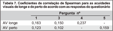 O teste de correlação de Spearman mostrou pobre correlação da acuidade visual, tanto de perto como de longe, com as perguntas selecionadas e analisadas do questionário de função visual. Os coeficientes de correlação foram muito baixos e variaram de 0,10 a 0,24 (Tabela 7), com p<0,05.