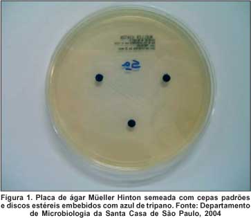 Além disso, foi realizado teste de ação inibitória do corante AT para estudo da atividade bacteriostática e bactericida. Foram selecionadas cepas padrões da coleção de cepas tipo americana (ATCC) de Pseudomonas aeruginosa (ATCC 27853), Escherichia coli (ATCC 25922) e Staphylococcus aureus (ATCC 25923) e semeadas em ágar Müeller Hinton. Em cada placa semeada com as cepas, foram adicionados três discos estéreis (blank) embebidos com o corante AT (Figura 1). As placas foram armazenadas na estufa do laboratório de Microbiologia e avaliadas após 24 horas.