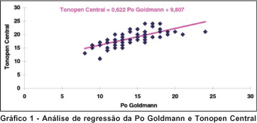 O gráfico 1 mostra a análise de regressão da medida da Po realizada pelo tonômetro de Goldmann e a medida realizada pelo Tonopen Central, e o gráfico 2, entre o tonômetro de Goldmann e o Tonopen Periférico. Observa-se maior dispersão dos valores no segundo gráfico em relação ao primeiro.