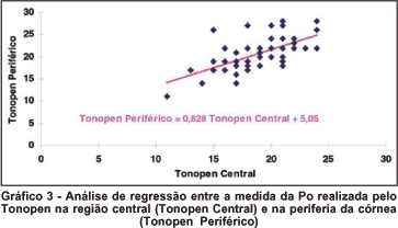 O gráfico 3 mostra a análise de regressão entre a medida da Po realizada pelo Tonopen na região central (Tonopen Central) e na periferia da córnea (Tonopen Periférico). Nota se novamente maior dispersão dos valores em relação ao gráfico 1.