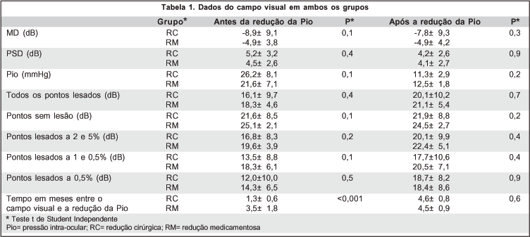 Em nosso estudo, os resultados dos campos visuais foram estatisticamente similares entre os grupos. Conseqüentemente, acreditamos que estamos simplesmente comparando ambos os grupos em relação à modalidade de tratamento e também segundo a redução da Pio, estatisticamente diferente entre os grupos (Tabela 3).