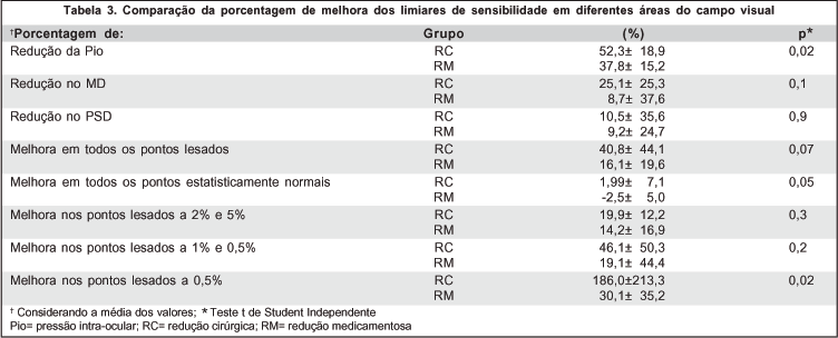 A melhora no campo visual após trabeculectomia (média de redução da Pio: 47,5% nos campos que demonstram melhora contra 40,0% naqueles sem melhora, p=0,7) é maior nas regiões com os menores níveis de sensibilidade antes da redução da Pio(13). Esses autores também postularam que os subgrupos com os melhores níveis de sensibilidade estão associados com células ganglionares predominantemente sadias, e conseqüentemente a probabilidade de melhora é menor. No presente estudo, a redução da Pio de 52,3±18,9% no grupo RC e 37,8±15,2% no grupo RM foi associada com a melhora nos pontos do campo visual com dano prévio (Tabela 2, p=0,03 e p=0,04, respectivamente), entretanto não significativo após a correção alfa. Somando-se a isto, ambos os grupos demonstraram melhora em regiões do campo visual com diferentes níveis de sensibilidade (Tabela 2).