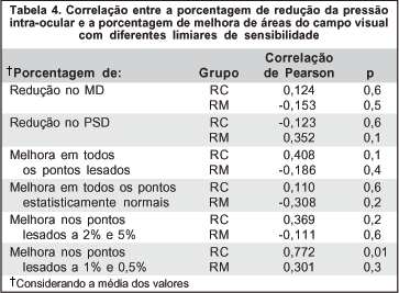 Ambos os grupos demonstraram melhora em vários parâmetros do campo visual após a redução da Pio (Tabela 2). Comparando os grupos em relação à porcentagem da redução dos índices globais do campo visual, e a porcentagem da melhora dos pontos do PD, apenas a redução da Pio e a melhora dos pontos 0,5% mostraram inicialmente diferença estatística, o que não aconteceu após correção do erro alfa (Tabela 3). A correlação de Pearson mostrou que apenas a porcentagem de melhora nos pontos 1% e 0,5% foram estatisticamente correlacionadas com a porcentagem de redução da Pio no grupo RC (r=0,772, p=0,01). Nenhuma variável foi correlacionada com a redução da Pio no grupo RM (Tabela 4).