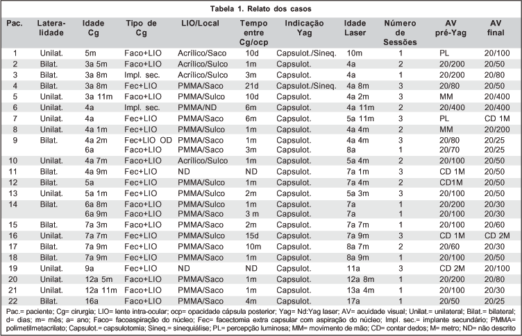 Crianças portadoras de catarata infantil e submetidas à cirurgia prévia com implante de LIO (Tabela 1) e posterior opacificação do eixo visual foram submetidas a Nd:Yag laser. A etiologia da catarata será descrita quando possível.