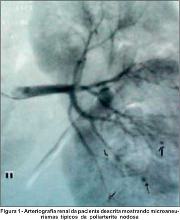 RFC, sexo feminino, 26 anos, tem diagnóstico de PAN a 6 meses antes do evento atual quando apresentou quadro de hipertensão arterial, mononeurite multiplex em membro superior D e inferior D além de vasculite retiniana com diminuição abrupta da acuidade visual do olho direito. Na época esteve internada no serviço de Reumatologia do HUEC tendo sido submetida à investigação que mostrou: pesquisa de fator antinuclear e sorologias para hepatite B, C, HIV negativas; complementos (C3 e C4), creatinina e hemograma normais. As provas de atividade inflamatória eram altas com VHS de 84 mm na primeira hora e proteína C reativa de 96 mg/l e o parcial de urina mostrava traços de proteína e ++ de cilindros hialinos por campo de grande aumento. Uma angiografia mesentérica e renal mostrou múltiplos microaneurismas na topografia de artérias segmentares intra-renais sendo, portanto, compatível com diagnóstico de PAN (Figura 1).