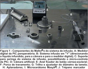 f) Sistema de infusão: É composto por: medidor digital; seringa descartável de 10 ml; suporte para a seringa, que possibilita o ajuste micrométrico (de 1 em 1 mmHg), por meio de um sistema de rosca, para mais ou para menos da pressão intra-cameral (PIC); e manguitos plásticos com bifurcação em "Y", para conexão com a câmara artificial e o medidor digital. Este sistema possui duas funções: 1) formação e manutenção da câmara anterior artificial; e 2) controle micrométrico da PIC per-operatória (Figuras 1A, B e C).