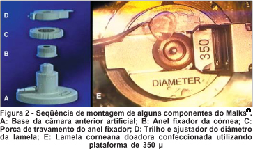 O MALKS®é constituído de oito partes: a) câmara artificial; b) anel fixador da córnea; c) porca de travamento do anel fixador; d) trilho e ajustador do diâmetro do disco lamelar; e) aplanadores para aferição e definição do diâmetro do disco lamelar; f) sistema de infusão, g) microcerátomo, e h) trépano marcador (Figuras 1 e 2). Esta câmara anterior artificial encontra-se em processo de patente pela empresa fabricante (registro Nº MU8501419-2).