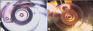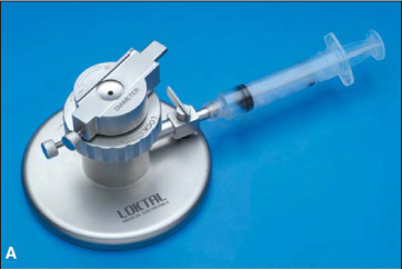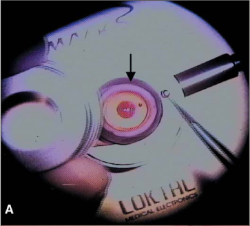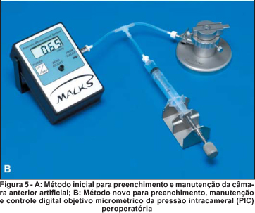 A Figura 5A mostra como a câmara anterior artificial era preenchida, para aferição pré-operatória da PIC com tonômetro de Barraquer. A Figura 5B mostra o novo método utilizado para preenchimento da câmara artificial e aferição digital objetiva da PIC peroperatória.