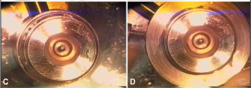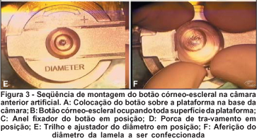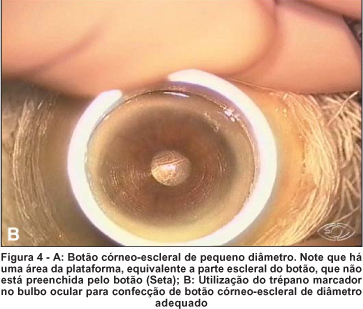 O anel escleral do botão córneo-escleral deve ter entre 15 e 17 mm, para o aproveitamento deste na câmara artificial. Anel escleral com diâmetro menor resulta em herniação do botão quando se tenta prendê-lo à câmara artificial com o anel fixador (Figura 4A). Por conseguinte, não se forma câmara, e o botão é inutilizado para o uso nesta câmara. Por esta razão, o trépano de alumínio foi incorporado ao sistema, para servir de marcador escleral nos bulbos oculares doadores, e obtenção de botão córneo-escleral de diâmetro adequado pelos Bancos de Olhos. (Figura 4B).