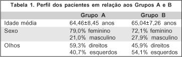 A idade variou de 35 a 79 anos, com média de 64,49±8,45 no Grupo A e de 47 a 79 anos, com média de 65,04±7,26 no Grupo B. No Grupo A, 79,0% dos casos eram do sexo feminino e 21,0% do sexo masculino e no Grupo B, 72,1% do sexo feminino e 27,9% do sexo masculino. Em relação ao olho operado, 59,3% eram direitos e 40,7% esquerdos no Grupo A, enquanto 45,9% eram direitos e 54,1% esquerdos no Grupo B (Tabela 1).