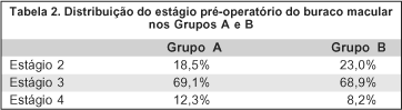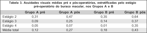 A tabela 3 mostra as acuidades visuais pré e pós-operatórias médias estratificadas por estágio pré-operatório do BM nos Grupos A e B.