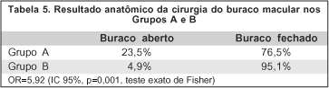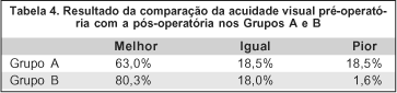 Quando comparamos a acuidade visual pré-operatória com a pós-operatória observamos melhora da acuidade visual em 63,0% dos casos no Grupo A e 80,3% dos casos no Grupo B, acuidade visual igual em 18,5% dos casos no Grupo A e 18,0% dos casos no Grupo B e piora da acuidade visual em 18,5% dos casos no grupo A e 1,6% dos casos no Grupo B (Tabela 4).