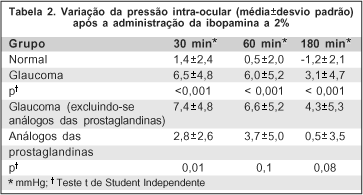 A distribuição da Pio antes do colírio de Ibopamina e após 30, 60 e 180 minutos encontra-se disposta na tabela 1. O aumento da Pio foi significativo aos 30, 60 e 180 minutos (p<0,001). A tabela 2 e a figura 1 ilustram o aumento da Pio nos subgrupos. O aumento da Pio nos pacientes utilizando análogos das prostaglandinas foi estatisticamente inferior em relação aos pacientes que usavam outras drogas (Tabelas 1 e 2; Figura 2).