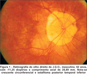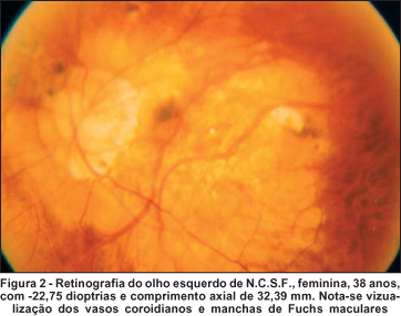 A atrofia corio-retiniana, difusa ou localizada, foi um achado universal, apresentando-se em graus variados. Os vasos da coróide puderam ser visualizados em 20 (35%) olhos. O estafiloma posterior foi encontrado em 6 (10,5%) olhos, mancha de Fuchs em 2 (3,5%) e "lacquer cracks" em apenas 1 (1,5%) olho.