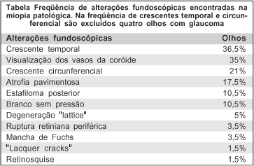 A alta miopia é freqüentemente associada com prolongamento excessivo e progressivo do olho, resultando em uma variedade de alterações fundoscópicas, associadas com graus variáveis de perda visual(6). Estas alterações acometem desde a fóvea até a periferia retiniana.
