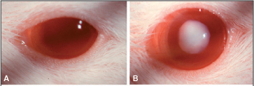 The development of cataract was assessed after one week by slit lamp examination (Zeiss model SL-10, Carl Zeiss Meditec, Germany). One of the authors (AJC), blinded regarding the studied groups, performed all slit lamp examinations. The pupils were dilated with a drop of a 1:1 mixture of 1% tropicamide and 10% phenylephrine hydrochloride (Ophthalmos Ltda, São Paulo, Brazil) and the development of cataract was graded by a scale of zero to 6, as previously described(18) and used by many authors(19-23). After slit lamp evaluation all animals were sacrificed by ethyl ether inhalation and their carcasses and all contaminated bedding material were collected by the municipal company (LIMPURB, São Paulo, Brazil) for subsequent incineration, according to guidelines of the Committee of Chemical Residues of UNIFESP - EPM.