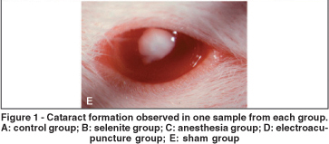 MÉTODO: Cinqüenta filhotes de ratos Wistar foram randomizados em 5 grupos: no Grupo 1 (Controle, n=10) nenhum procedimento foi realizado. Grupo 2 (Selenito, n=10), selenito de sódio (30 µmoles/kg) foi injetado por via subcutânea no décimo dia de vida. No Grupo 3 (Anestesia, n=10), filhotes receberam a mesma dose de selenito e sofreram anestesia inalatória com éter etílico durante 10 minutos diariamente por 1 semana. Grupo 4 (eletro-acupuntura, n=10), os animais sofreram os mesmos procedimentos do Grupo 3, porém também receberam eletro-acupuntura (2 Hz, 50 mA) aplicada nos pontos Neiguan (PC 6) e Guangming (GB37) durante o período de anestesia. Grupo 5 (Sham, n=10), os ratos foram submetidos aos mesmos procedimentos que o Grupo 4, porém as agulhas foram aplicadas em pontos falsos. O desenvolvimento da catarata foi avaliado após uma semana por lâmpada de fenda.