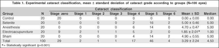 RESULTS: All control rats lenses (Group 1) were clear. Groups 2, 3 and 5 rats developed more severe cataract or complete opacification. In Group 4 (electroacupuncture), 45% of eyes did not develop cataract while thirty per cent developed less severe cataract than Groups 2, 3 and 5. The between-group difference was statistically significant (p<0.001). Lens opacification grade in Groups 1 and 4 was lower than in the Groups 2, 3 and 5 (p<0.001).