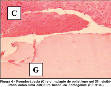 Grupo PG: houve somente uma esfera que chegou ao final do período idealizado para estudo. O exame histológico desta esfera mostrou material inerte, sem reação fibrovascular no seu interior. Ao redor desta esfera, observou-se pseudocápsula constituída por fibroblastos (Figura 4).