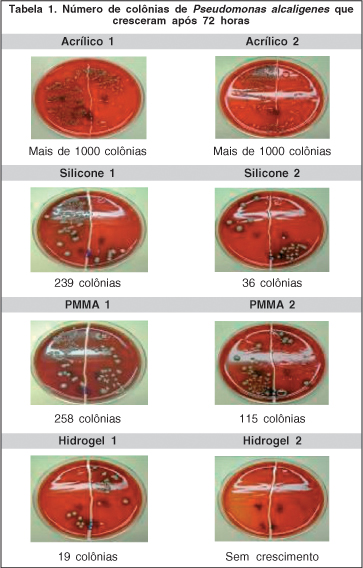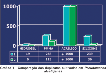 A tabela 1 mostra o crescimento da Pseudomonas alcaligenes nos quatro grupos de LIOs. A densidade da aderência é expressa pelo número de colônias formadas nas placas de ágar-sangue após 72h. As lentes de hidrogel tiveram o menor grau de aderência bacteriana se comparadas com as LIOs de acrílico, de silicone e de PMMA (Gráfico 1). A densidade de bactérias aderidas nas lentes de silicone e de PMMA foram semelhantes e menores que as de acrílico. O grau de aderência da Pseudomonas alcaligenes em ordem decrescente foi: acrílico, PMMA, silicone e hidrogel.
