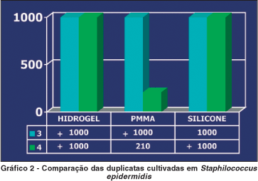 A tabela 2 mostra a aderência do Staphylococcus epidermidis em três grupos de LIOs. Não houve diferença expressiva entre as lentes de PMMA, silicone e hidrogel (Gráfico 2). Entretanto, a segunda lente de PMMA testada teve aderência bacteriana menor se compararmos com as lentes de silicone, hidrogel e com a primeira lente de PMMA testada.