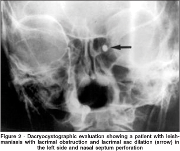 METHODS: Forty-five leishmaniasis-treated patients (90 nasolacrimal ducts) were submitted to lacrimal excretory system evaluation. All were evaluated by Jones I test and when it was abnormal, dacryocystography and nasal endoscopy were performed. This situation occurred in 13 patients (26 nasolacrimal ducts).