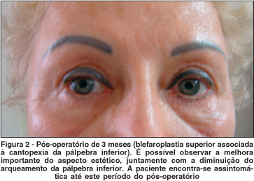 No planejamento da blefaroplastia, faz-se necessário uma detalhada história ocular, além da avaliação da anatomia orbitária e peri-orbitária(12). Existem trabalhos relatando que certas características anatômicas das estruturas orbitárias e peri-orbitárias, que incluem exoftalmia, flacidez da pálpebra inferior, hipoplasia malar e esclera aparente, demonstram estatisticamente serem fatores de propensão para o desenvolvimento da síndrome do olho seco no pós-operatório(8). No presente estudo, encontramos apenas três pacientes (10,34%) com tais características no pré-operatório (flacidez da pálpebra inferior), sendo a mesma corrigida durante a blefaroplastia (Figuras 1 e 2). Talvez por esse motivo, os resultados discordem dos encontrados por outros autores, que apresentaram uma maior incidência de olho seco após a blefaroplastia, provavelmente por possuírem um grupo de pacientes mais susceptível a complicações no pós-operatório(5,8).