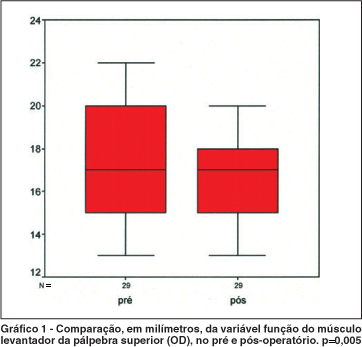 As medidas das fendas palpebrais verticais, horizontais e da função do músculo levantador da pálpebra superior, em milímetros, no pré e no pós-operatório, encontraram-se na tabela 2. Observou-se um aumento estatisticamente significativo da fenda palpebral vertical, além de uma diminuição também estatisticamente significativa da fenda palpebral horizontal e da função do músculo levantador da pálpebra superior, no pós-operatório.