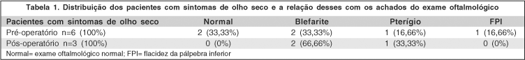 Em relação às queixas relacionadas a sintomas de olho seco, observou-se que 6 pacientes (20,69%), apresentavam tais queixas no pré-operatório e apenas 3 (10,34%), as apresentavam no pós-operatório. Na tabela 1, pode-se encontrar a distribuição dos pacientes com sintomas de olho seco no pré e no pós-operatório e a relação desses com os achados do exame oftalmológico.