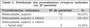 O tipo de procedimento cirúrgico realizado em todos os pacientes consistiu na blefaroplastia superior e/ou inferior conservadora, com ressecção em bloco dos tecidos da lamela anterior, que incluiu pele, tecido subcutâneo e músculo orbicular(10). Em alguns casos selecionados, realizou-se a retirada de bolsa(s) de gordura, além de cirurgia para melhorar a flacidez da pálpebra inferior ("tarsal strip"), como pode ser observado na tabela 5.