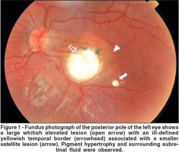 A 5-year-old boy with eye deviation for nine months was referred for examination. Both physical examination and a complete blood cell count with differential count were normal. Visual acuity was 20/20 in the right eye and counter fingers at 1m in the left eye and a medium angle endotropia was noticed. The anterior segment was quiet and the intraocular pressure was normal. An ill-defined whitish elevated lesion associated to smaller satellite lesions with a serous retinal detachment were observed in the macula of the left eye (Figure 1). No abnormalities were found in the right eye.
