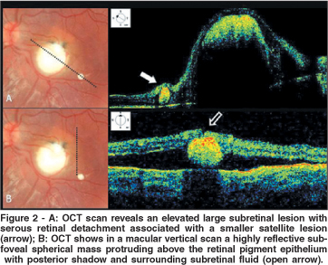 Upon OCT examination, a central highly reflective subretinal round mass and another one smaller satellite mass structure, surrounded by subretinal fluid, were seen protruding above the retinal pigment epithelium in the macular area of the left eye (Figure 1).