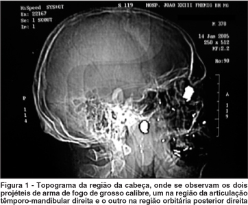 Paciente G.G., 38 anos, casado, masculino, faioderma, operador de máquinas, procedente de Contagem, região metropolitana de Belo Horizonte (MG), deu entrada na emergência do Hospital de Pronto-Socorro João XXIII, na noite do dia 14/01/05, vítima de agressão por arma de fogo na região cefálica.