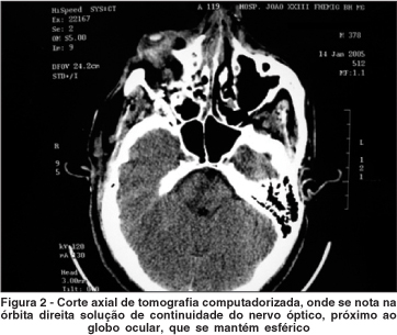 Já na TC notava-se a presença do projétil na órbita direita, hemorragia retrobulbar de médio volume e uma solução de continuidade do nervo óptico, junto ao globo ocular, sugerindo avulsão traumática do mesmo (Figura 2). O bulbo ocular, por sua vez, mantinha sua esfericidade, com bolsões hemorrágicos coroidianos e musculatura extra-ocular íntegra, inserida normalmente.